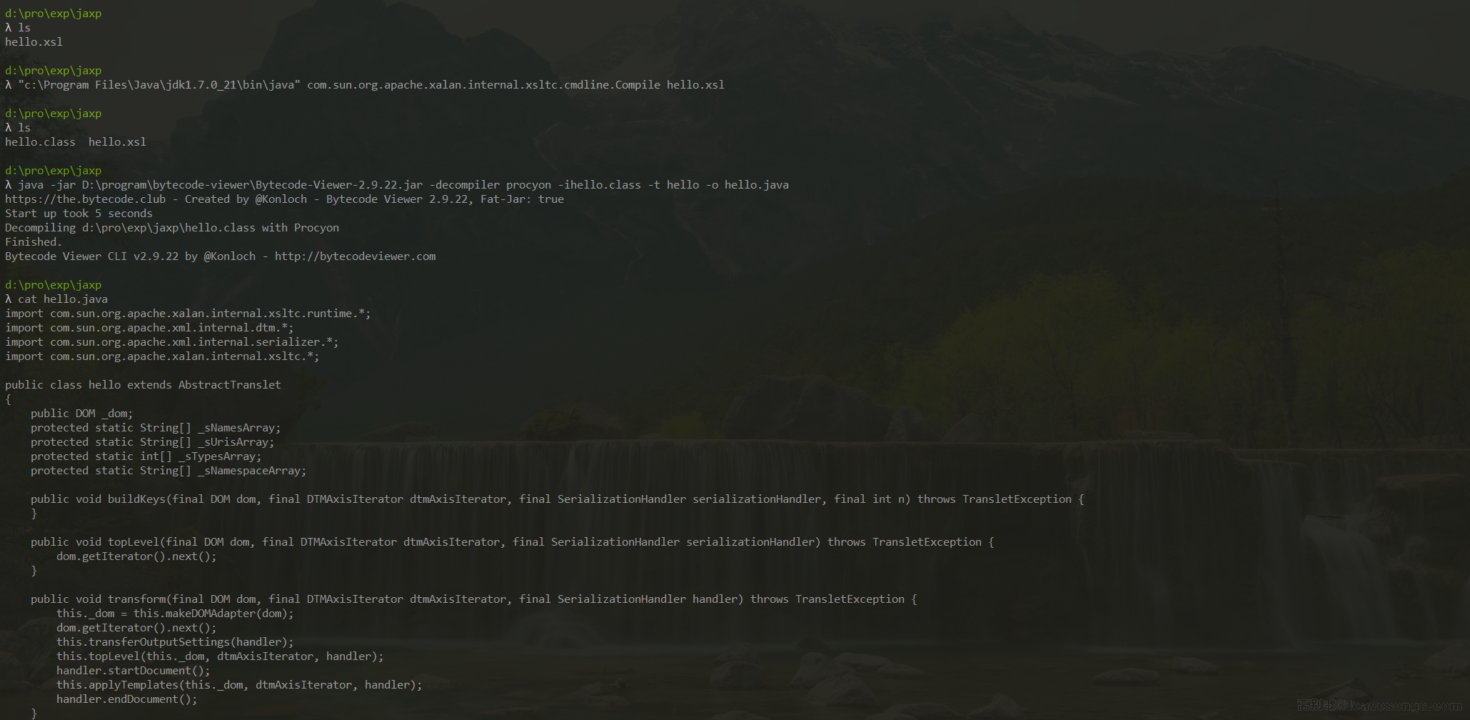 可见,从hello.xsl生成了hello.class,反编译这个class即可看到源代码。