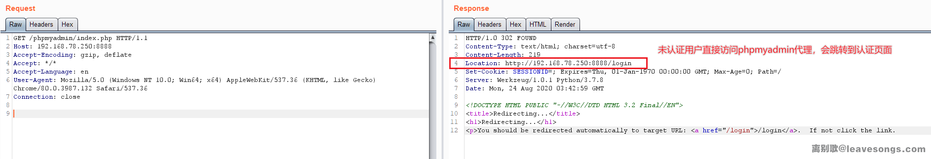 如果一个未认证的用户,直接访问http://ip:8888/phpmyadmin/index.php呢?会被直接重定向到登录页面: