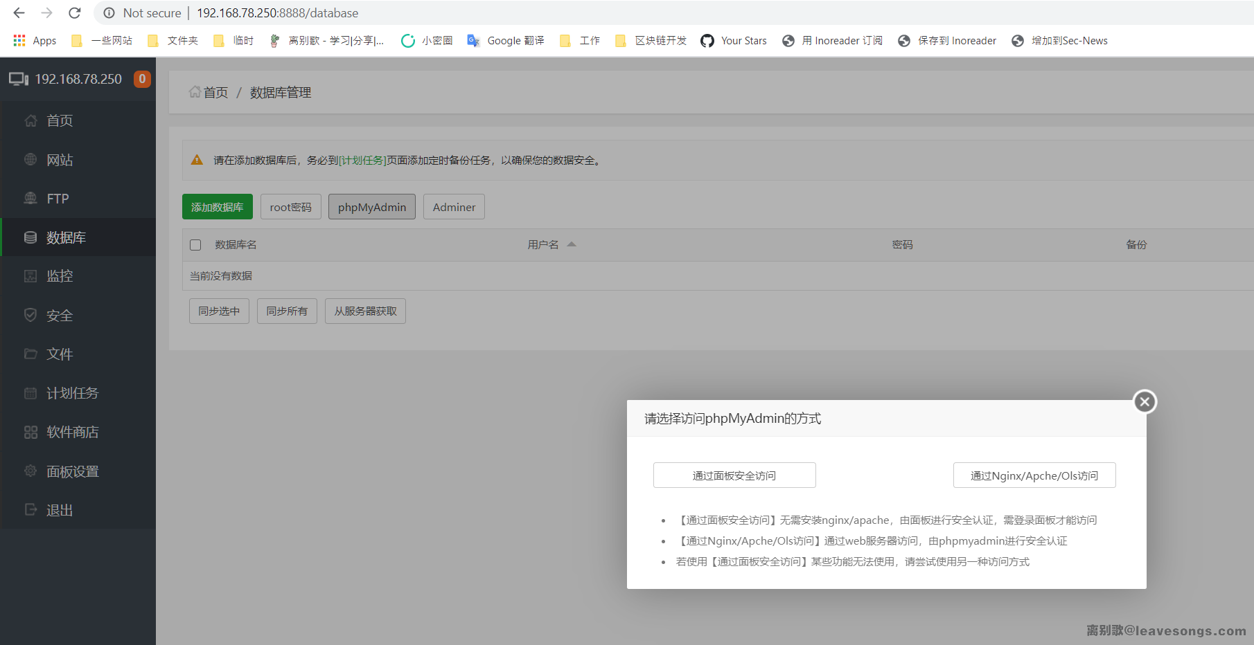 我们可以来复现一下这个漏洞。首先,我们以系统管理员的身份登录宝塔后台,来到数据库页面,点击“phpMyAdmin”按钮,会弹出如下模态框: