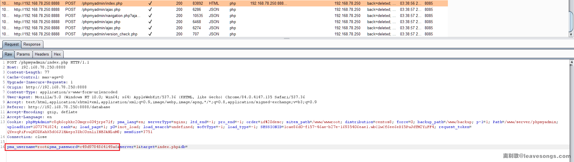 宝塔前端将我们的Mysql账号密码填好了直接发给phpmyadmin。又因为我们前面分析过的那段代码,后台将账号密码直接写入了phpmyadmin配置文件,来做到免认证的逻辑。