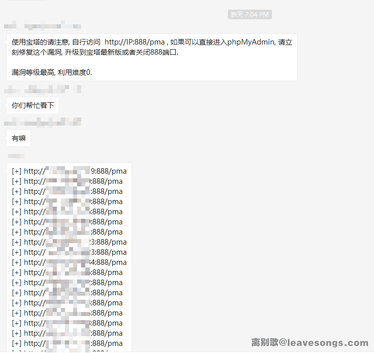 周日晚,某群里突然发布了一则消息,宝塔面板的phpmyadmin存在未授权访问漏洞的紧急漏洞预警,并给出了一大批存在漏洞的URL: