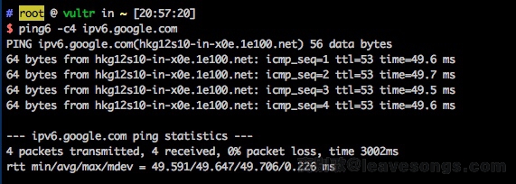 这样在vps上执行ifconfig的时候就可以看到一个ipv6地址,尝试ping6 -c4 ipv6.google.com就可以发现成功: