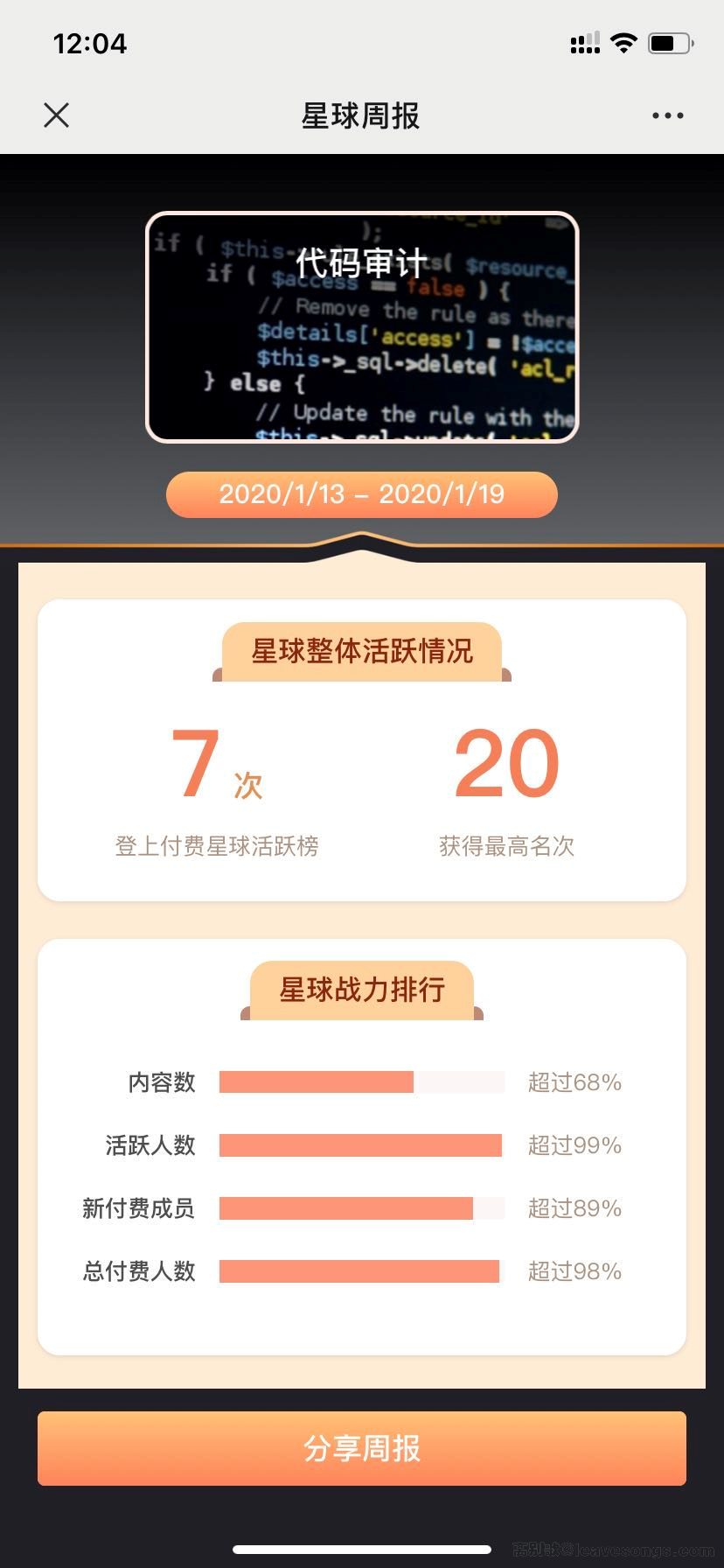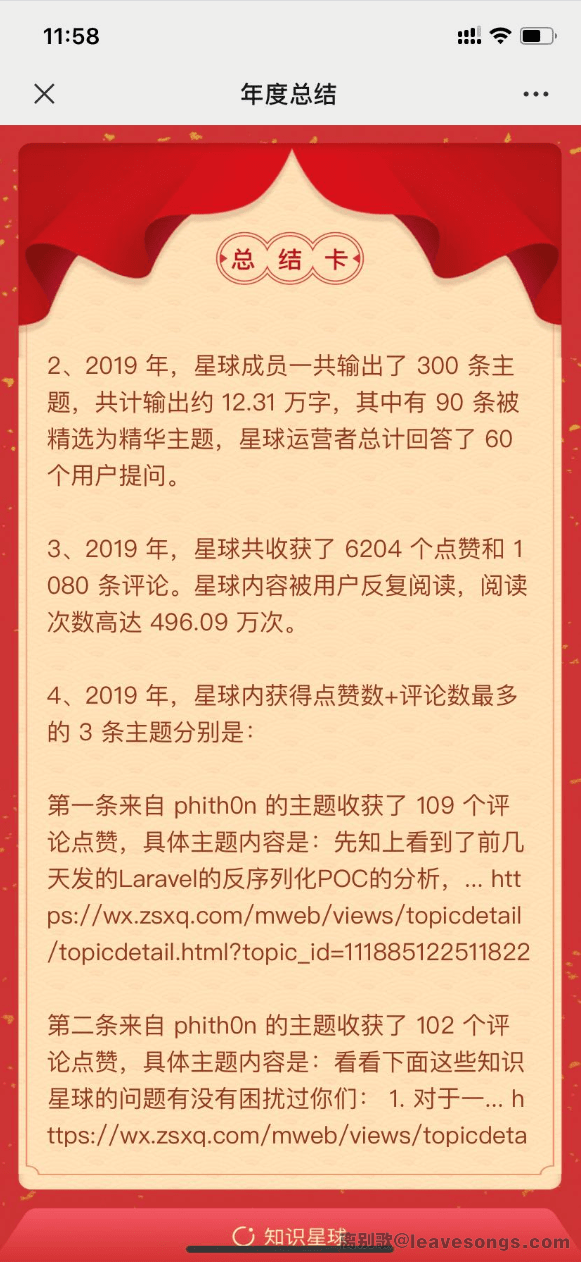 另外,前几页星球官方也给我推送的2019年的年终总结和周总结,对于数据我是比较满意的,希望2020年能更上一层楼: