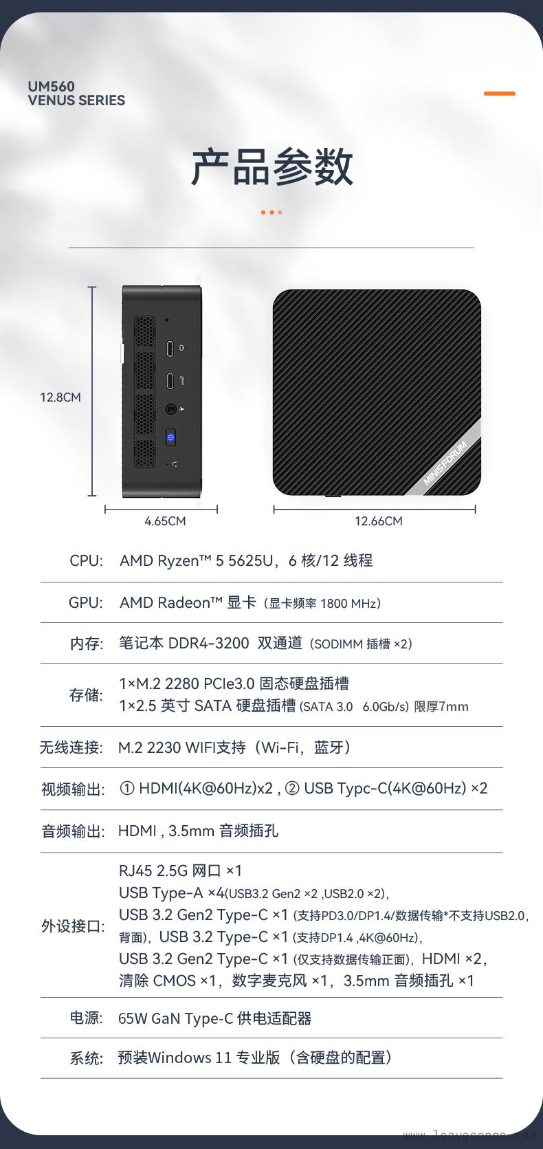 今年6月的时候看到他们家出了一款新主机UM560,用的是今年AMD发布的新CPU 5625U,预售价格在359美元(国内价格不到2000人民币)。这个6核12线程CPU性能不算特别强,仍然是Zen 3架构,内存也只支持DDR4,但我看中的主要是它的低功耗——TDP只有15W。也就是说,即使我不习惯用这台机器办公,也可以作为homelab替换我现在的渣联想。